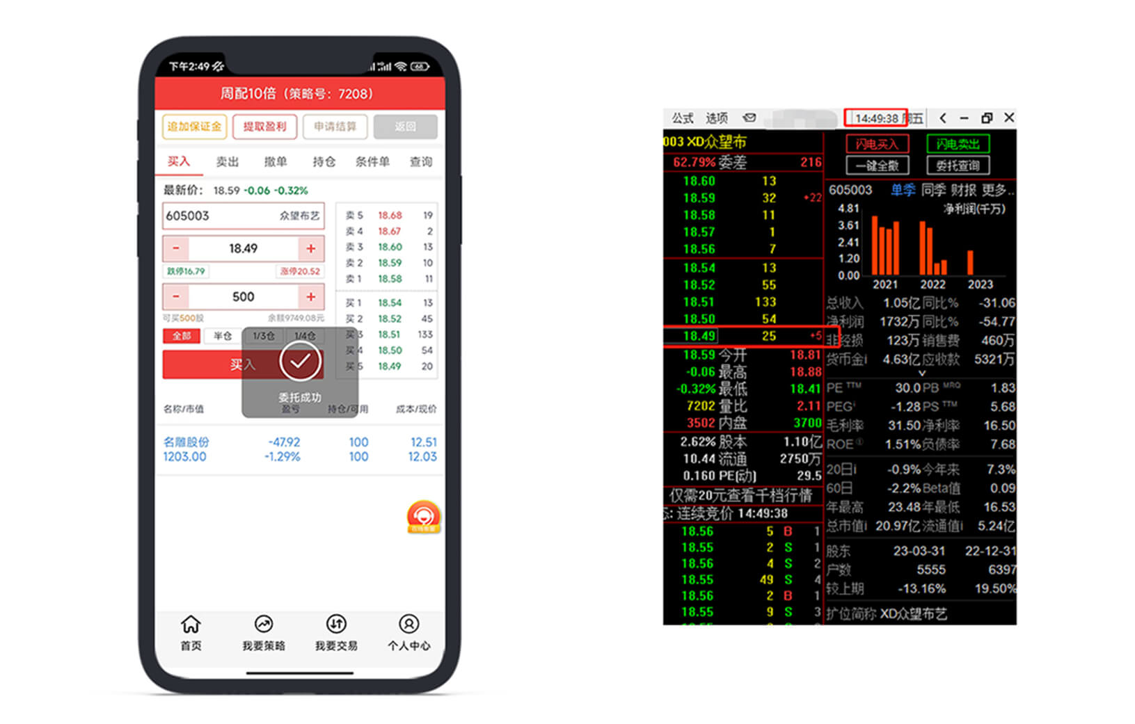 找一只股票委托下单。如605003 众望布艺,在我们的交易APP委托价格:18.29元,委托股数500股。此时买5挡位18.49元是20挂单。